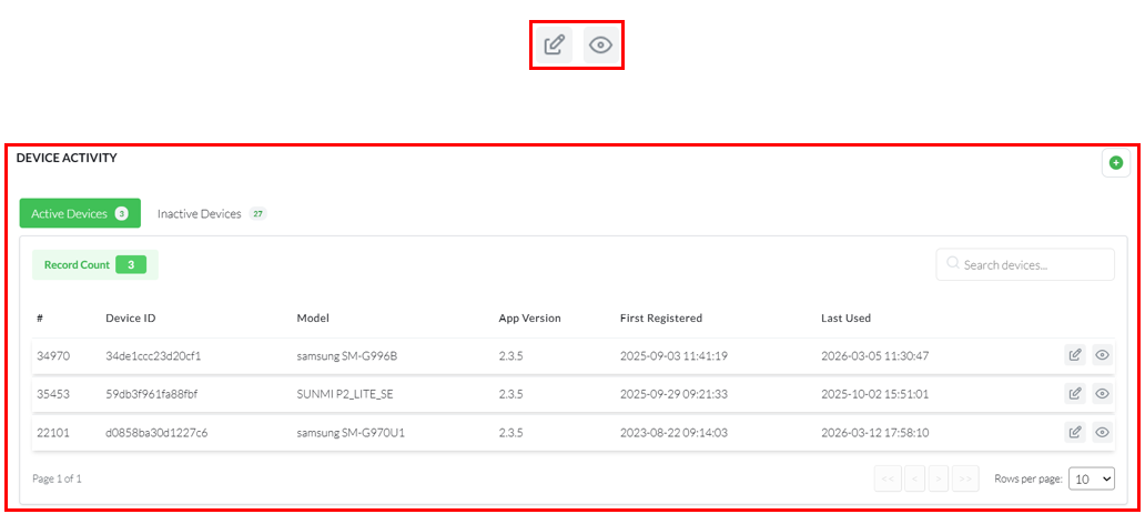 For each Active registered device, there is an edit button that looks like a pen and a view button that looks like an eye.