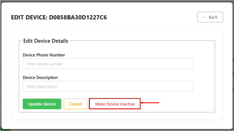 Step 6: Device details will be shown and there will be options to UPDATE DEVICE information or to MAKE DEVICE INACTIVE. Select "Make Device Inactive".