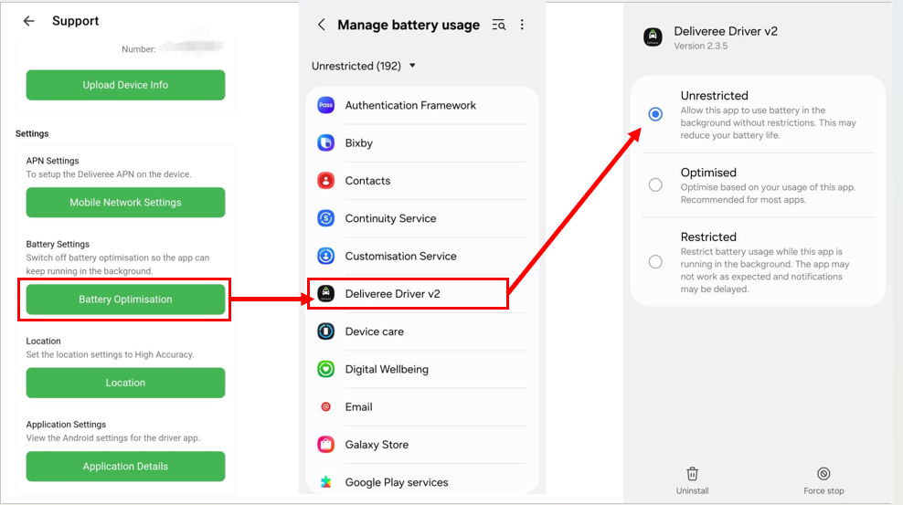 Switch off battery optimisation for the Deliveree Driver application so the app can continue to run in the background even when the device is on battery save.